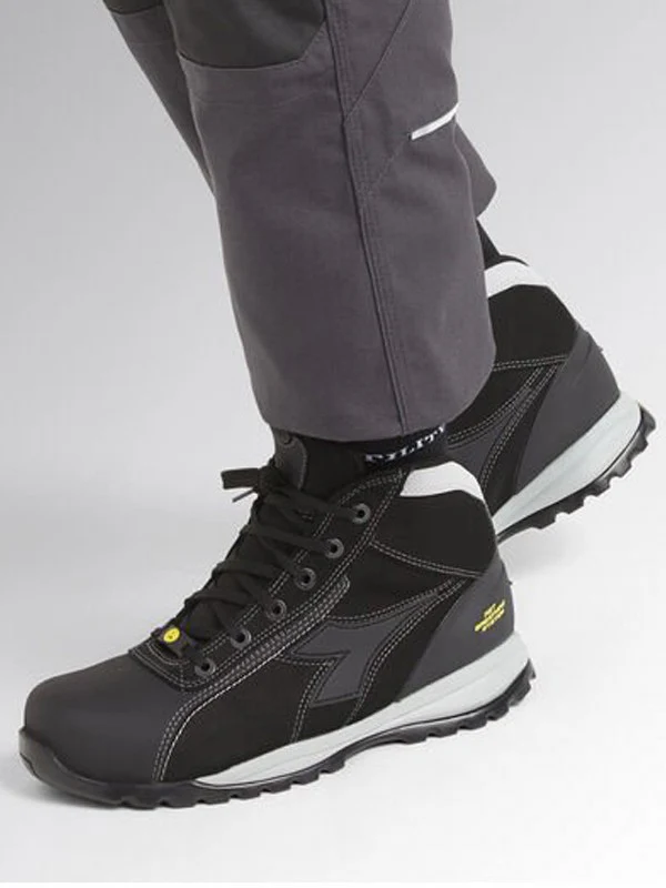 Les chaussures de sécurité hautes GloveTech de Diadora en cuir Perwanger sont conçues pour résister aux rayures, être imperméables et respirantes grâce à son système de respiration Net Breathing System breveté par GEOX.