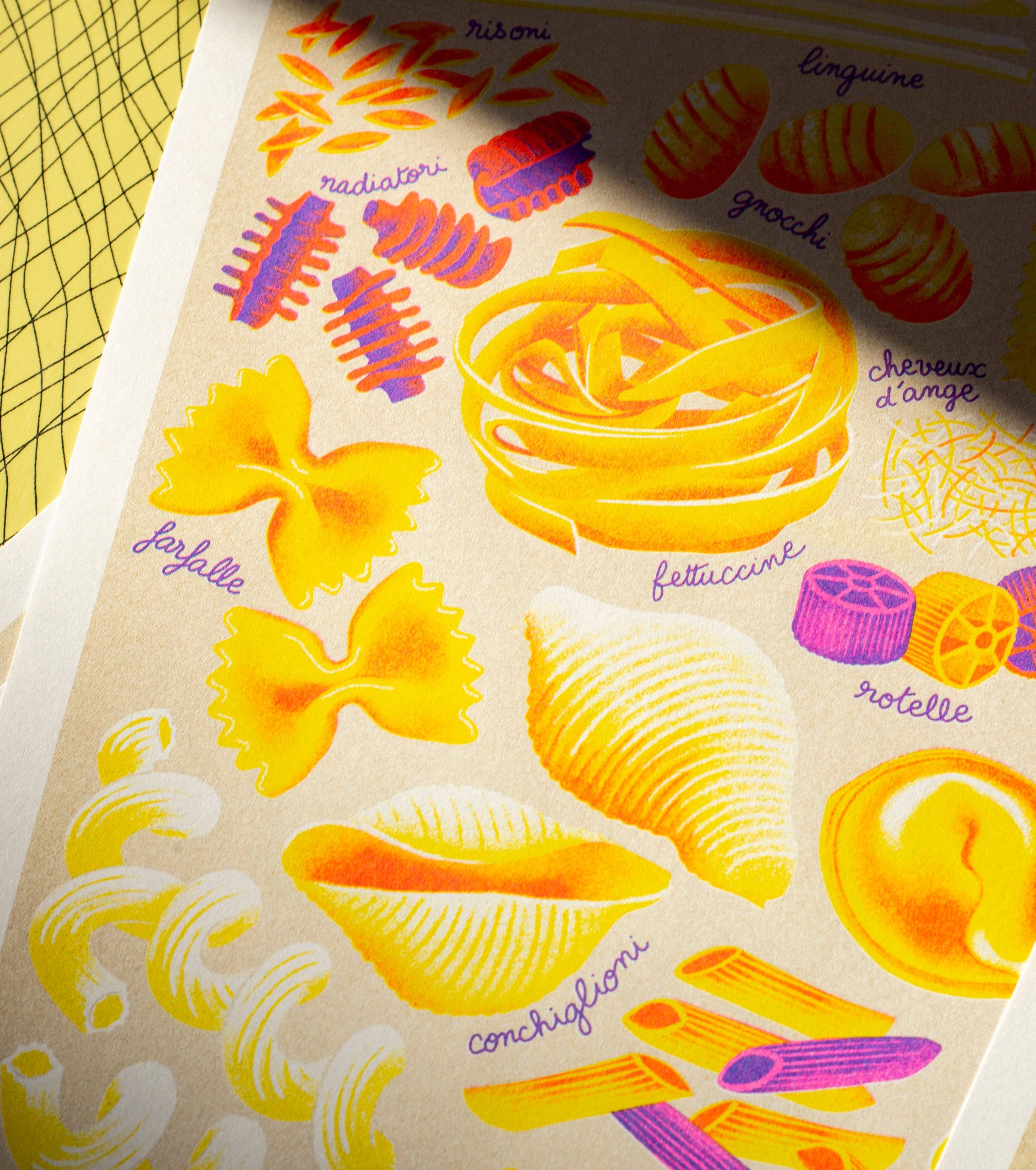 🍝 𝗣𝗮̂𝘁𝗲𝘀 – 𝗣𝗮𝘀𝘁𝗮🍝 By illustrator Manon Bucciarelli (France) Risography printing by KIBLIND Atelier On Munken Print White 150g paper Format A3 – 29,7 x 42 cm Poster delivered packed, with rigid cardboard support ————————- Originally, Manon Bucciarelli made a name for herself designing book covers. Her mastery of lettering and her striking illustrations have […]