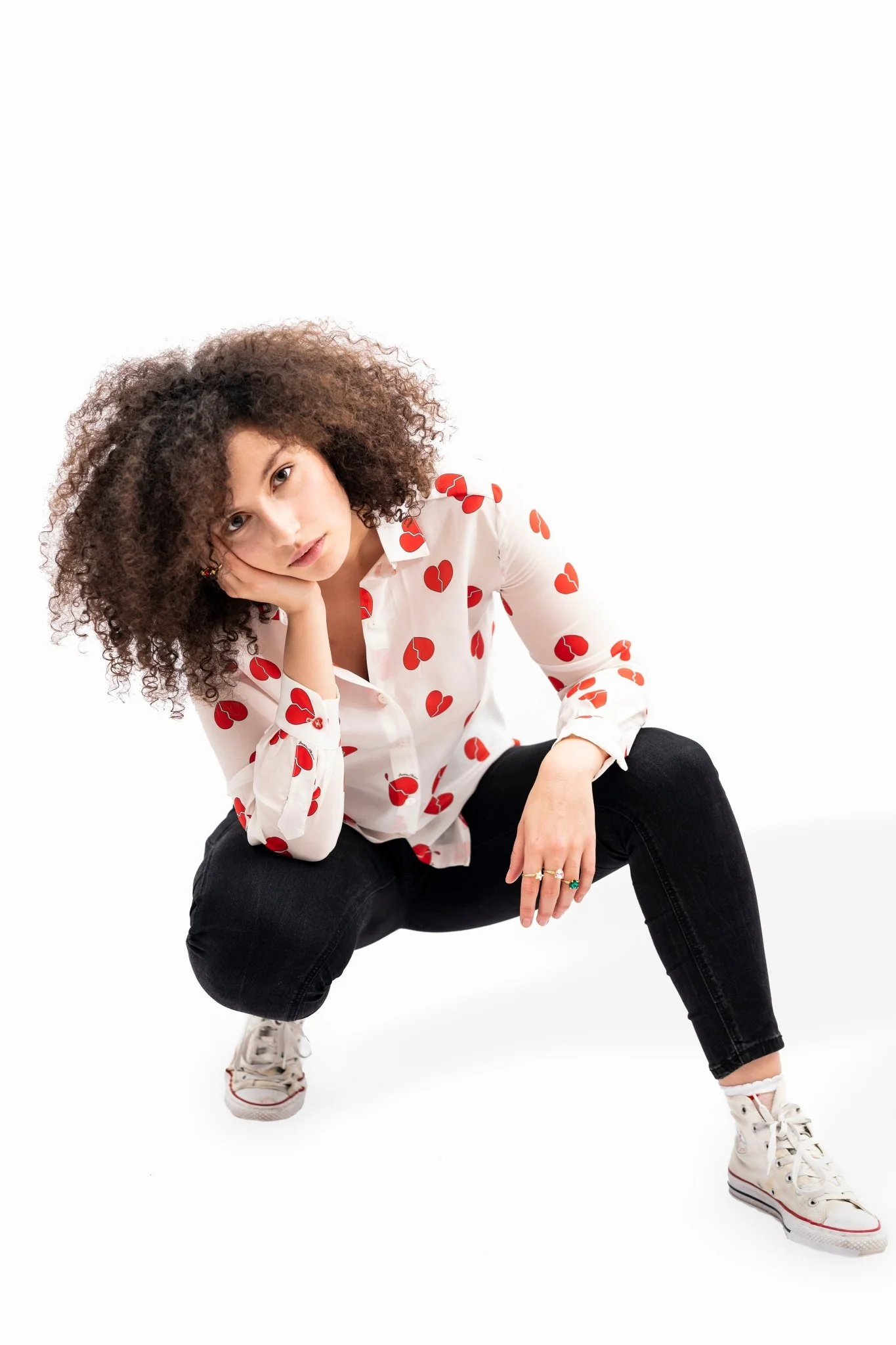 Ce chemisier en soie avec des cœurs rouges est notre chemisier iconique qui se boutonne à l’avant et aux poignets avec des boutons en forme de cœurs. (Eh oui, même les boutons ont des cœurs !) Le chemisier à coeurs rouges se porte facilement avec un jean ou un pantalon large.