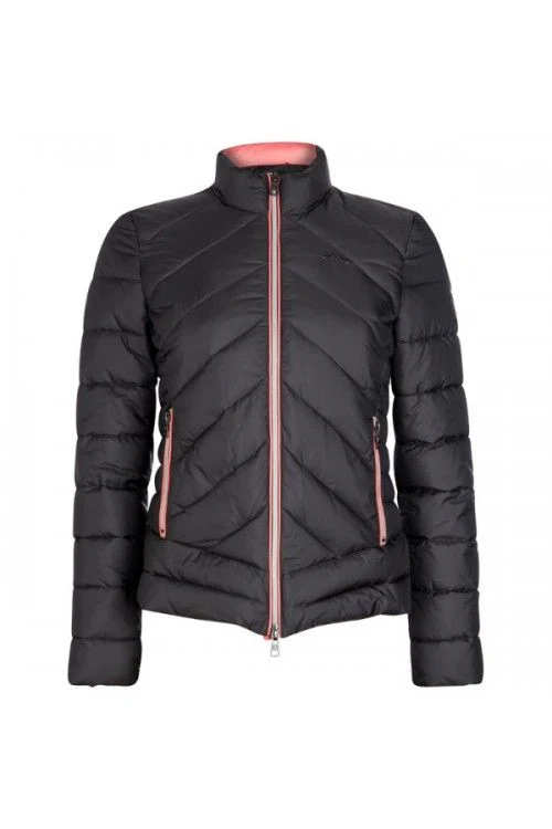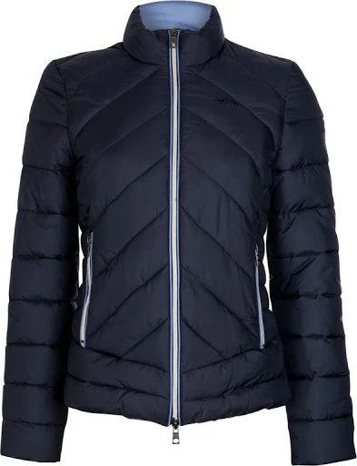 Veste femme élégante et fonctionnelle. Col intérieur contrasté assorti aux fermetures éclairs. Matelassure en chevrons pour marquer la féminité. Pas de capuche. Poches latérales verticales zippées.