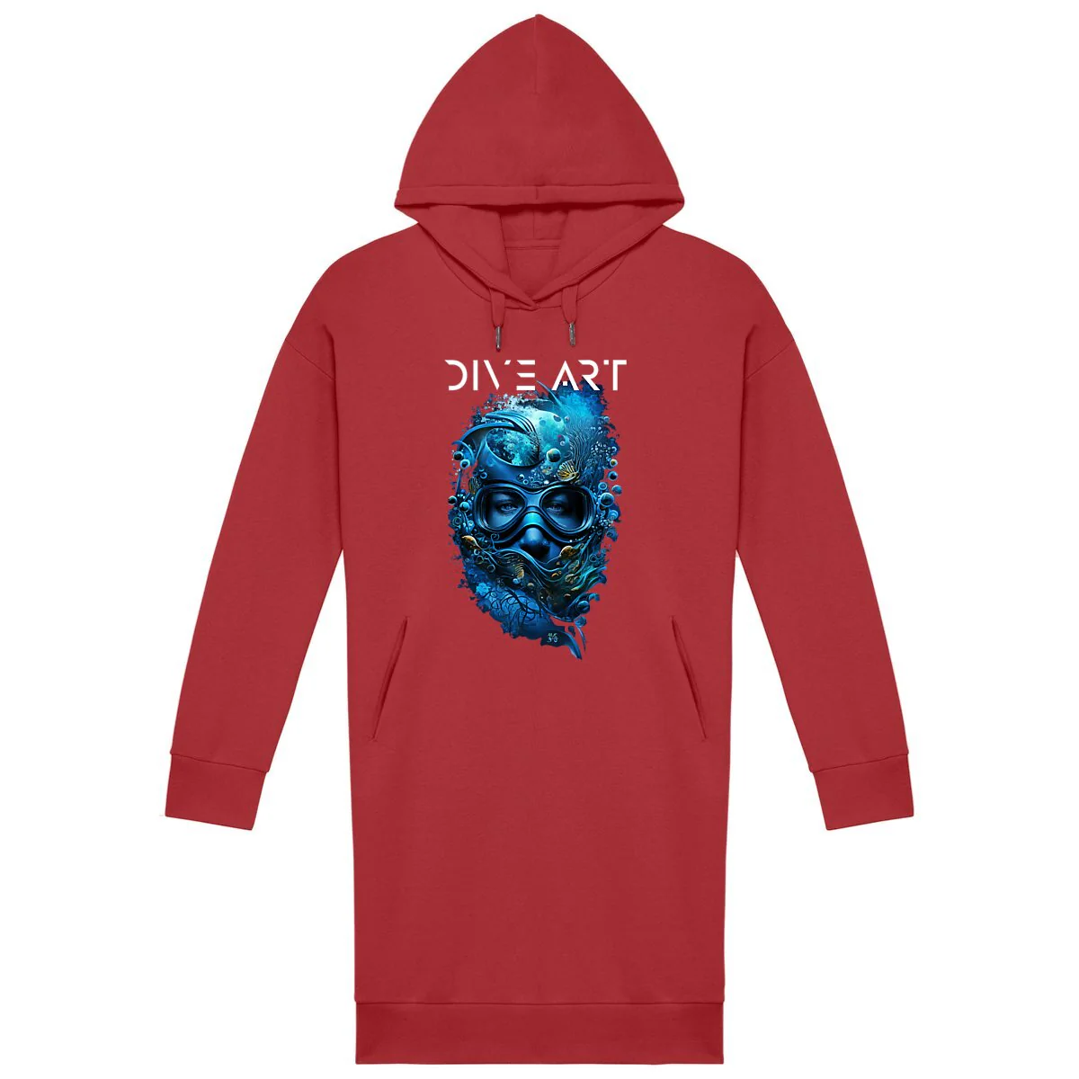 Cette œuvre d’art vestimentaire vous transporte dans un futur aquatique fascinant où une plongeuse fusionne harmonieusement avec son environnement marin.
