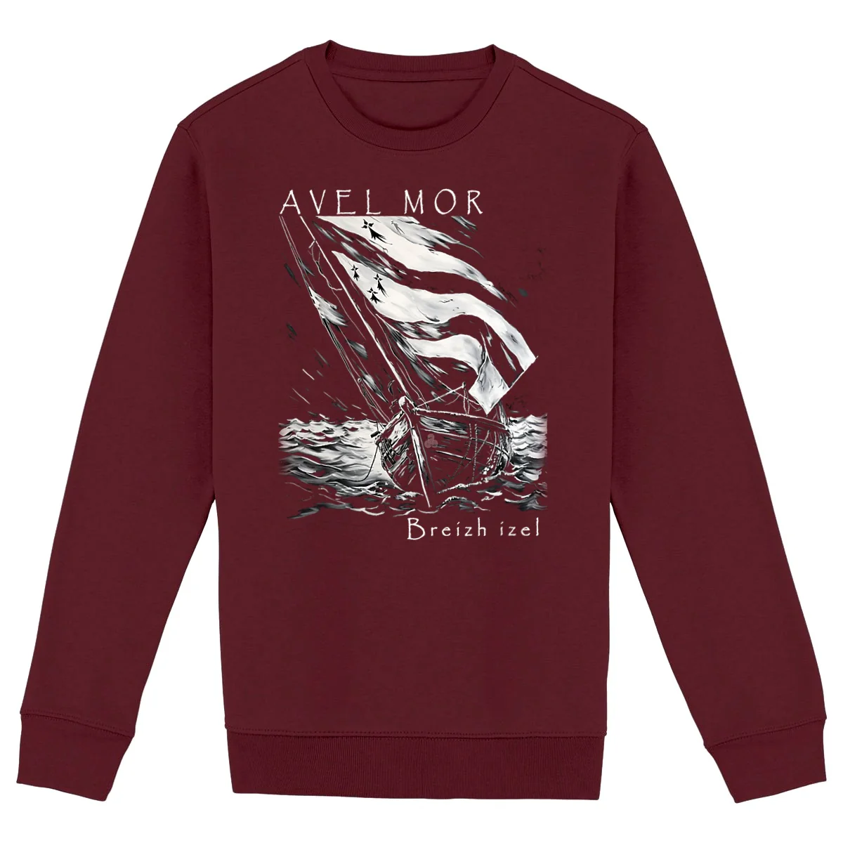 Bretagne mer et légendes Avel mor : le vent de la mer. Un voilier breton, fier dans le vent , toutes voiles gonflées aux couleurs de la Bretagne. Disponible du XS au 3XL – Produit TOP qualité – 85% coton biologique, 15% polyester recyclé post-consumer – Sweat épais (350 g/m2) – Coupe ajustée