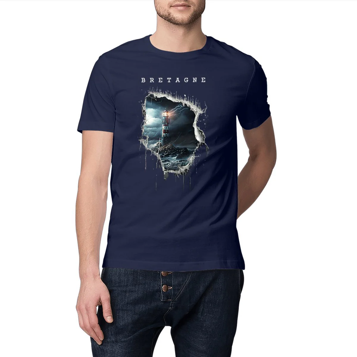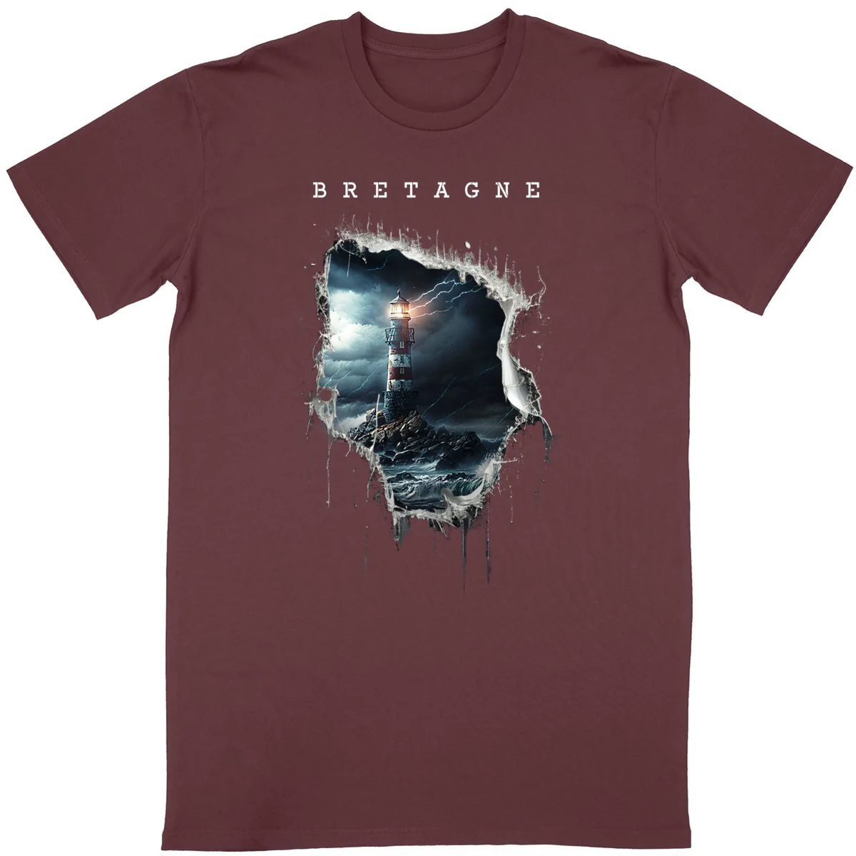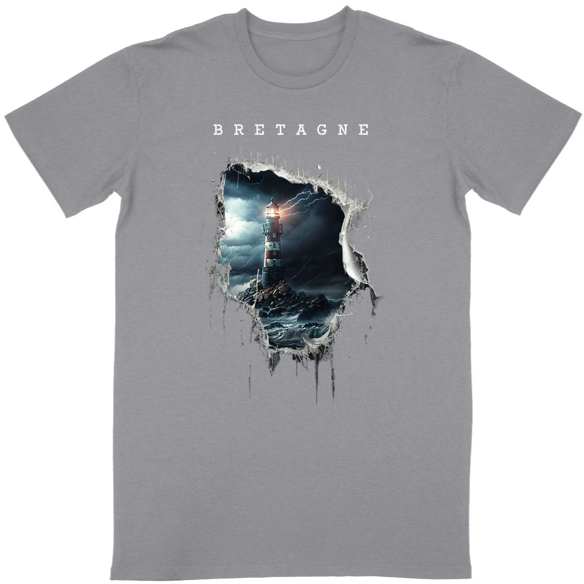 Bretagne mer et légendes La mer bretonne déchainée déchire votre T-shirt laissant apparaitre un magnifique phare breton dans la tempête. Disponible du S au 3XL – 100% coton en conversion biologique – Produit TOP qualité – T-shirt léger (140 – 155 g/m2) – Unisexe – Coupe tubulaire