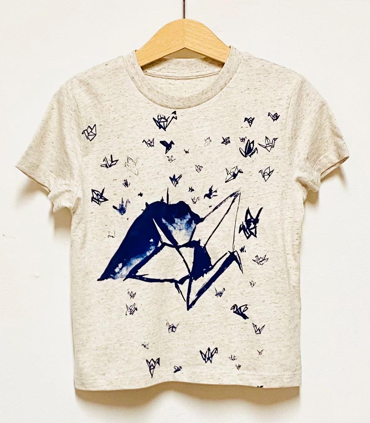 Dans un Monde toujours plus confus, une Nature en danger et une Paix relative, j’ai voulu représenté un petit souffle de poésie et même si il n’y a pas 1000 grues sur mon dessin le fait de l’avoir imprimé en série et de le voir porté symbolise pour moi ma petite prière pour demain.